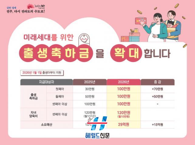 ÀüÁֽô 2026³â 1¿ù 1ÀÏ ÀÌÈÄ Ãâ»ý¾Æ¿¡°Ô Ãâ»ýÃàÇÏ±Ý 100¸¸ ¿øÀ» ÀϽñÝÀ¸·Î Áö±ÞÇÑ´Ù°í 15ÀÏ ¹àÇû´Ù.