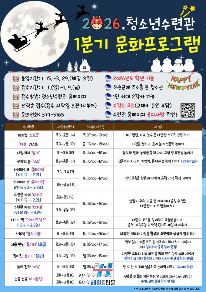 ÇÑÆí, 1¿ù 4ÀϺÎÅÍ 1¿ù 9ÀϱîÁö ȼø±ºÃ»¼Ò³â¼ö·Ã°ü ´©¸®Áý(https://hwasunyouth.kr/)¡®ÇÁ·Î±×·¥ ½Åû °Ô½ÃÆÇ¡¯À» ÅëÇØ ¿Â¶óÀÎÀ¸·Î Á¢¼öÇÏ¸é µÈ´Ù. 1ºÐ±â ÇÁ·Î±×·¥Àº 1¿ù 15ÀϺÎÅÍ 3¿ù 29ÀϱîÁö ¿î¿µµÇ¸ç, ȼø±º¿¡ ÁÖ¼Ò¸¦ µÐ û¼Ò³âÀº ´©±¸³ª Âü¿©ÇÒ ¼ö ÀÖ´Ù.