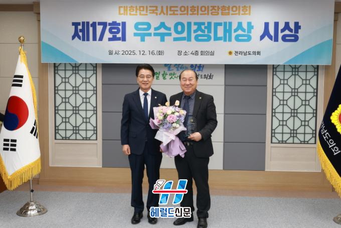 [Çì·²µå½Å¹® = ³ë½Â¾ð ±âÀÚ] Àü¶ó³²µµÀÇȸ °Á¤ÀÏ ÀÇ¿ø(´õºÒ¾î¹ÎÁÖ´ç, ±¤¾ç2)ÀÌ Áö³ 16ÀÏ ´ëÇѹα¹½ÃµµÀÇȸÀÇÀåÇùÀÇȸ°¡ ¼ö¿©ÇÏ´Â ¡®Á¦17ȸ ¿ì¼öÀÇÁ¤´ë»ó¡¯ ¼ö»óÀÚ·Î ¼±Á¤µÆ´Ù.