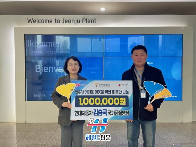 [Çì·²µå½Å¹® = ³ë½Â¾ð ±âÀÚ] Çö´ëÀÚµ¿Â÷ ÀüÁÖ°øÀå ±è½Â±¹ ±¹°¡Ç°Áú¸íÀåÀº 16ÀÏ ÀüÁֽú¹ÁöÀç´Ü(ÀÌ»çÀå À±¹æ¼·)¿¡ ¾î·Á¿î ÀÌ¿ôÀ» À§ÇÑ ¼º±Ý 100¸¸ ¿øÀ» ±âŹÇß´Ù.