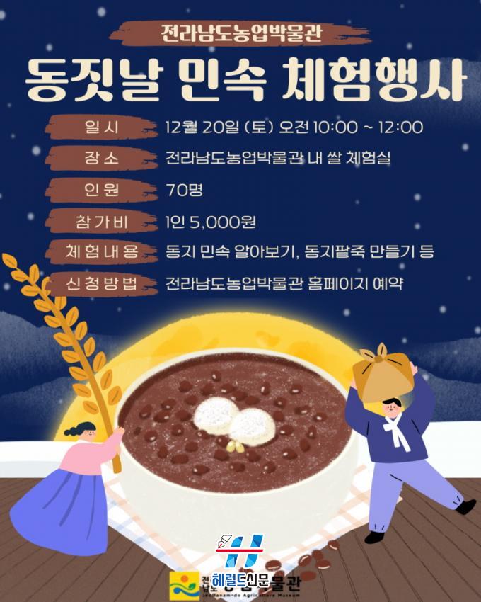 Çà»ç´Â µ¿Áþ³¯ÀÇ Àý±âÀû ÀÇ¹Ì¿Í ÀüÅë ¹Î¼ÓÀ» ¼Ò°³Çϰí, µ¿ÁöÆÏÁ×À» ¸¸µé¾î º¸´Â üÇè Á᫐ ÇÁ·Î±×·¥À¸·Î ±¸¼ºµÆ´Ù. ¼±Âø¼ø 70¸íÀ̸ç, Âü°¡ ½ÅûÀº Àü³²µµ³ó¾÷¹Ú¹°°ü ´©¸®Áý(http://www.jam.go.kr)¿¡ ÇÏ¸é µÈ´Ù. Âü°¡ºñ´Â ¹«·á´Ù.