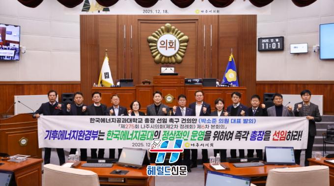 [Çì·²µå½Å¹® = Àü¿µ±Ô ±âÀÚ] ³ªÁÖ½ÃÀÇȸ(ÀÇÀå ÀÌÀç³²)´Â 18ÀÏ Á¦275ȸ Á¤·Êȸ Á¦6Â÷ º»È¸ÀǸ¦ ¿°í ¡®Çѱ¹¿¡³ÊÁö°ø°ú´ëÇб³ ÃÑÀå ¼±ÀÓ Ã˱¸ °ÇÀǾȡ¯À» äÅÃÇß´Ù.