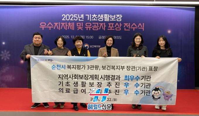 [Çì·²µå½Å¹® = ³ë½Â¾ð ±âÀÚ] ¼øÃµ½Ã´Â º¸°Çº¹ÁöºÎ ÁÖ°ü 2025³â ¡°Áö¿ªº¹Áö»ç¾÷ Æò°¡¡± 3°³ ºÐ¾ß¿¡¼ ÀÕµû¶ó ¼ö»óÀ» ÇÏ¸ç ¸í½Ç»óºÎÇÑ ¡°ÀÏ·ù º¹Áöµµ½Ã¡±·Î¼ÀÇ À§»óÀ» È®°íÈ÷ Çß´Ù.