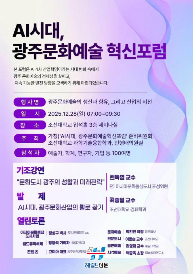 [Çì·²µå½Å¹® = ³ë½Â¾ð ±âÀÚ] ¹ÎÇü¹è ±¹È¸ÀÇ¿ø(´õºÒ¾î¹ÎÁÖ´ç, ±¤ÁÖ ±¤»êÀ»)Àº ¿À´Â 12¿ù 28ÀÏ(ÀÏ) ¿ÀÀü 7½Ã¿¡ Á¶¼±´ëÇб³ ÀÔ¼®È¦ 3Ãþ ¼¼¹Ì³ª½Ç¿¡¼ ¡®AI½Ã´ë, ±¤ÁÖ¹®È¿¹¼úÇõ½ÅÆ÷·³¡¯ ÁغñÀ§¿øÈ¸, Á¶¼±´ëÇб³ °úÇбâ¼úÀ¶ÇÕÇаú¿Í °øµ¿À¸·Î¡®AI½Ã´ë, ±¤ÁÖ¹®È¿¹¼ú Çõ½Å Æ÷·³'À» °³ÃÖÇÑ´Ù.