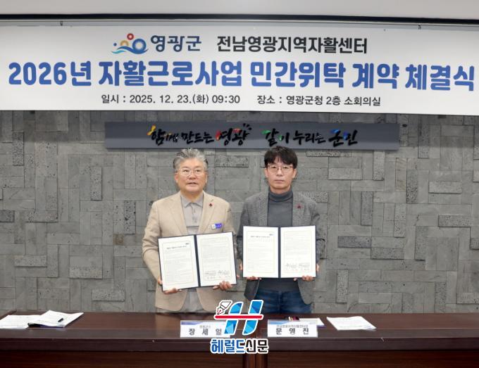 [Çì·²µå½Å¹® = ¼Û±Ù³² ±âÀÚ] ¿µ±¤±ºÀº 12¿ù 23ÀÏ ¿µ±¤±ºÃ» 2Ãþ ¼ÒȸÀǽǿ¡¼ Àü³²¿µ±¤Áö¿ªÀÚȰ¼¾ÅÍ(¼¾ÅÍÀå ¹®¿µÁø)¿Í 2026³â ÀÚȰ±Ù·Î»ç¾÷ ¹Î°£À§Å¹ ¹× °³ÀÎÁ¤º¸Ã³¸® À§Å¹ °è¾àÀ» ü°áÇß´Ù°í ¹àÇû´Ù.
