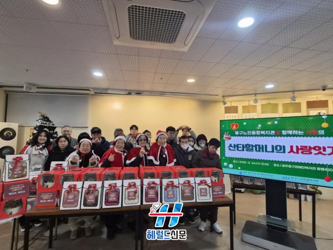[Çì·²µå½Å¹® = Á¤µ·Ã¶ ±âÀÚ] ±¤ÁÖ±¤¿ª½Ã µ¿±¸ ³ëÀεéÀÌ Å©¸®½º¸¶½º À̺긦 ¸Â¾Æ Áö¿ª Àå¾ÖÀÎ ÀÌ¿ô¿¡°Ô µû¶æÇÑ Á¤À» ÀüÇÏ´Â ¡®»êŸÇÒ¸Ó´Ï¡¯·Î º¯½ÅÇØ ´«±æÀ» ²ö´Ù.