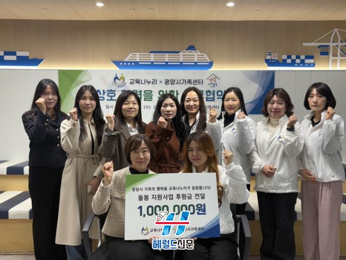 Çù¾à½Ä°ú ÇÔ²² ¿¸° ÈÄ¿ø±Ý Àü´Þ½Ä¿¡¼´Â ±³À°³ª´©¸®°¡ ±¤¾ç½Ã°¡Á·¼¾ÅÍ µ¹º½Áö¿øÆÀ¿¡ ÈÄ¿ø±Ý 100¸¸ ¿øÀ» ±âŹÇßÀ¸¸ç, ÇØ´ç ÈÄ¿ø±ÝÀº °¡Á· ´ë»ó µ¹º½Áö¿ø»ç¾÷ÀÎ ¡®°øµ¿À°¾Æ³ª´®ÅÍ¡¯ ÇÁ·Î±×·¥ ¿î¿µ¿¡ Ȱ¿ëµÉ ¿¹Á¤ÀÌ´Ù.