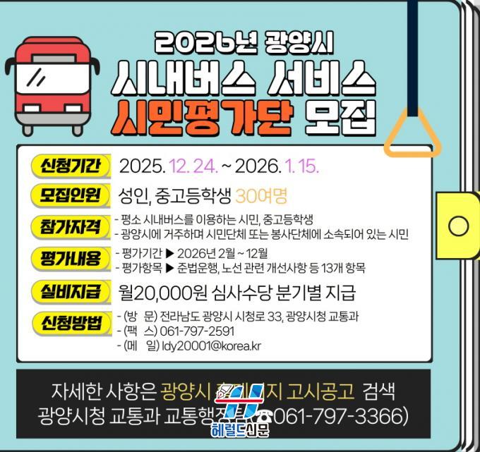 ½Ã¹ÎÆò°¡´ÜÀº ¼ºÀΰú Áß¡¤°íµîÇлý 30¸í ³»¿Ü·Î ±¸¼ºµÇ¸ç, 2026³â 2¿ùºÎÅÍ 12¿ù±îÁö °ü³» ¿î¼ö¾÷üÀÎ ±¤¾ç±³ÅëÀÌ ¿î¿µÇÏ´Â 30°³ ³ë¼±À» ´ë»óÀ¸·Î Á÷Á¢ ½Ã³»¹ö½º¸¦ ÀÌ¿ëÇÏ¸ç Æò°¡ Ȱµ¿À» ¼öÇàÇÏ°Ô µÈ´Ù. ÁÖ¿ä Æò°¡ ³»¿ëÀº Áعý ¿îÇà ¿©ºÎ, Ä£Àýµµ, ¾ÈÀü¼º, ³ë¼± ¿î¿µÀÇ ÀûÁ¤¼º µî ½Ã³»¹ö½º ¼ºñ½º Àü¹ÝÀÌ´Ù.