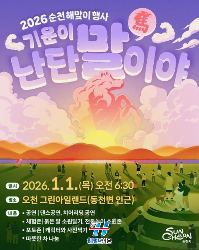 [Çì·²µå½Å¹® = ³ë½Â¾ð ±âÀÚ] ¼øÃµ½Ã´Â 2026³â 1¿ù 1ÀÏ, ½Ã¹ÎµéÀÇ »õÇØ Ȱ·ÂÀ» ºÒ¾î³ÖÀ» º´¿À³â ÇØ¸ÂÀÌ Çà»ç¸¦ ¿Àõ±×¸°¾ÆÀÏ·£µå¿¡¼ °³ÃÖÇÑ´Ù. ÀÏÃ⠽ð¢ ÀüÀÎ ¿ÀÀü 6½Ã 30ºÐºÎÅÍ 8½Ã±îÁö ½Ã¹Îµé°ú ÇÔ²² »õÇØ¸¦ ¸ÂÀÌÇÒ ¿¹Á¤ÀÌ´Ù.