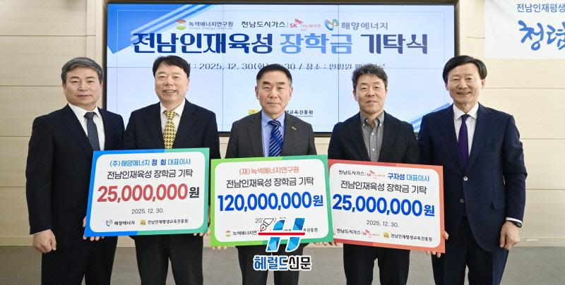 [Çì·²µå½Å¹® = ³ë½Â¾ð ±âÀÚ] Àü¶ó³²µµ´Â 30ÀÏ ÀÎÀçÀ°¼º ÀåÇбÝÀ¸·Î (Àç)³ì»ö¿¡³ÊÁö¿¬±¸¿øÀÌ 1¾ï 2õ¸¸ ¿ø, Àü³²µµ½Ã°¡½º(ÁÖ)°¡ 2õ500¸¸¿ø, ¢ßÇØ¾ç¿¡³ÊÁö°¡ 2õ500¸¸ ¿øÀ» Àü³²ÀÎÀçÆò»ý±³À°ÁøÈï¿ø¿¡ ±âŹÇß´Ù°í ¹àÇû´Ù.