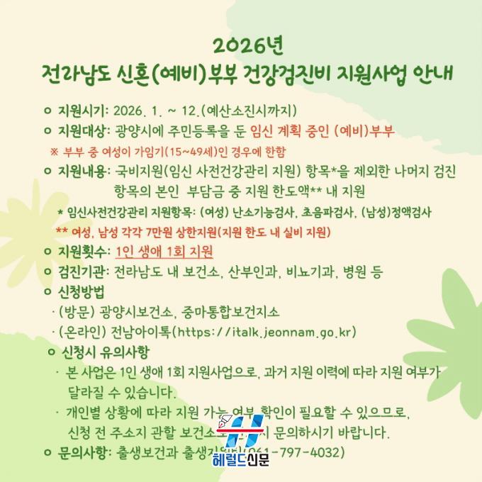 [Çì·²µå½Å¹® = ³ë½Â¾ð ±âÀÚ] ±¤¾ç½Ã´Â Àü¶ó³²µµ°¡ ÃßÁøÇÏ´Â ¡®½ÅÈ¥(¿¹ºñ)ºÎºÎ °Ç°°ËÁøºñ Áö¿ø»ç¾÷¡¯¿¡ ¸ÂÃç, 2026³â¿¡µµ ÀÓ½ÅÀ» ÁغñÇÏ´Â ºÎºÎ¸¦ ´ë»óÀ¸·Î °Ç°°ËÁøºñ Áö¿ø»ç¾÷À» Áö¼Ó ¿î¿µÇÑ´Ù°í ¹àÇû´Ù.