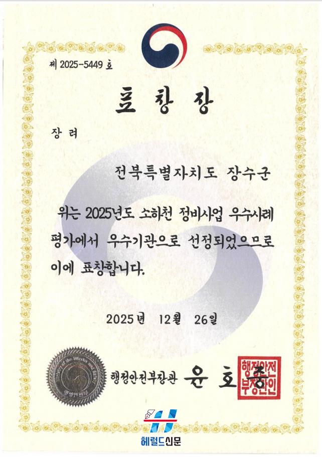 [Çì·²µå½Å¹® = ³ë½Â¾ð ±âÀÚ] Àå¼ö±ºÀº ÇàÁ¤¾ÈÀüºÎ ÁÖ°ü¡®2025³â ¼ÒÇÏõ Á¤ºñ»ç¾÷ ¿ì¼ö»ç·Ê °ø¸ð¡¯¿¡¼ 'Àå·Á»ó' À» ¼ö»óÇÏ´Â Äè°Å¸¦ °Åµ×´Ù.