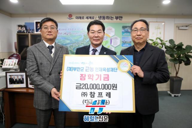 [Çì·²µå½Å¹® = ³ë½Â¾ð ±âÀÚ] ºÎ¾È±º ±Ù³óÀÎÀçÀ°¼ºÀç´ÜÀº ¢ßÂüÇÁ·¹(´ëÇ¥ ±èÀçÀ±)°¡ Áö³ÇØ 12¿ù 30ÀÏ Áö¿ª ÀÎÀç À°¼ºÀ» À§ÇÑ ÀåÇÐ±Ý 2000¸¸¿øÀ» ±âŹÇß´Ù°í ¹àÇû´Ù.