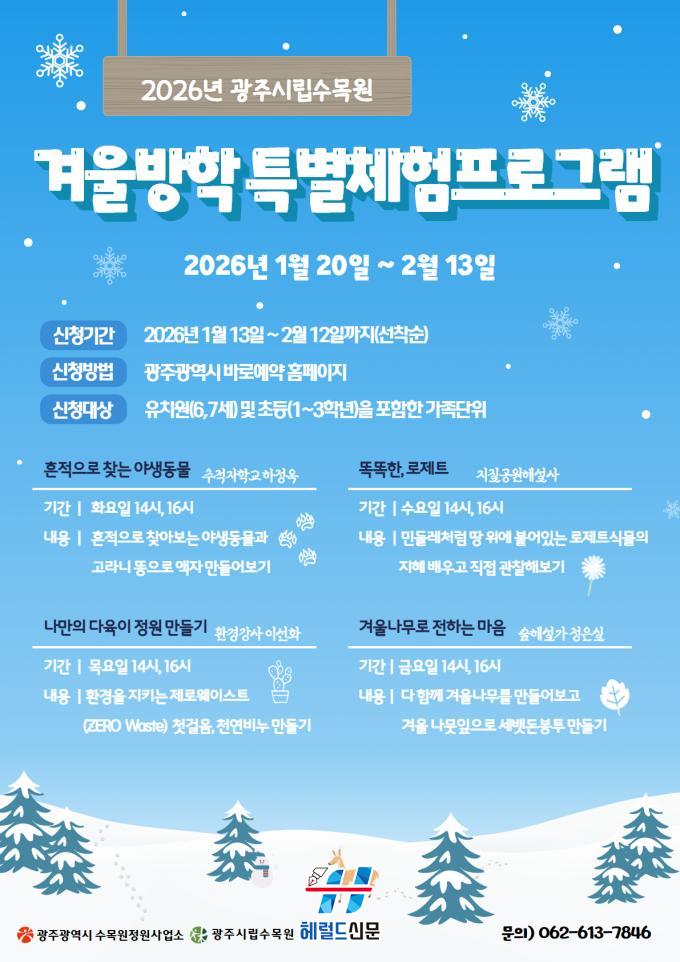 [Çì·²µå½Å¹® = ³ë½Â¾ð ±âÀÚ] ±¤ÁÖ±¤¿ª½Ã ½Ã¸³¼ö¸ñ¿øÀº ¾î¸°À̸¦ À§ÇÑ ¡®2026³â °Ü¿ï¹æÇРüÇè ÇÁ·Î±×·¥¡¯ Âü°¡ÀÚ 640¸íÀ» ¿À´Â 13ÀÏ ¿ÀÀü 10½ÃºÎÅÍ ¼±Âø¼ø ¸ðÁýÇÑ´Ù.