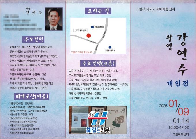 [Çì·²µå½Å¹® = ³ë½Â¾ð ±âÀÚ] °íÈﱺ(±º¼ö °ø¿µ¹Î)Àº ¿À´Â 1¿ù 9ÀϺÎÅÍ 14ÀϱîÁö °íÈï¾ÆÆ®¼¾ÅÍ¿¡¼ ¡®°íÈï ÇϳªµÇ±â ¼¿¹ ÀÛǰ Àü½Ãȸ¡¯¸¦ °³ÃÖÇÑ´Ù°í ¹àÇû´Ù.