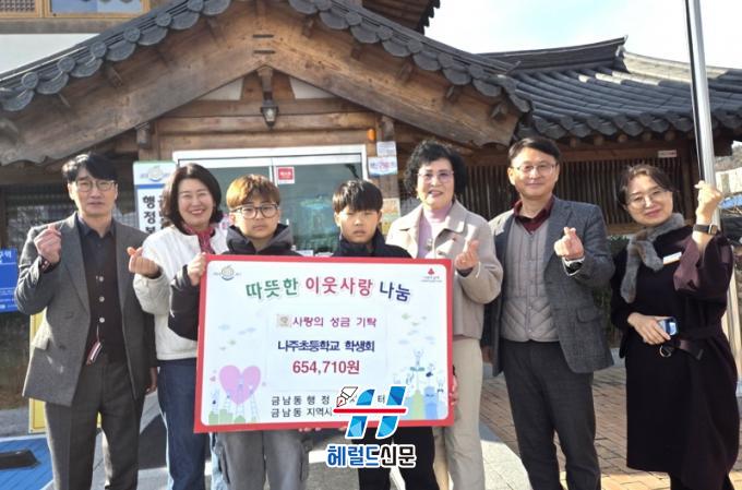 ³ªÁÖÃʵîÇб³ Çлýȸ¿Í Çкθðȸ´Â Áö³ 5ÀÏ ¡®³ªÁÖÃʵîÇб³ ³ª´®ÀåÅÍ¡¯¸¦ ÅëÇØ ¸¶·ÃÇÑ ¼öÀÍ±Ý 65¸¸ 4710¿øÀ» ¾î·Á¿î ÀÌ¿ô¿¡°Ô ÀüÇØ´Þ¶ó¸ç ±Ý³²µ¿¿¡ ±âŹÇß´Ù.