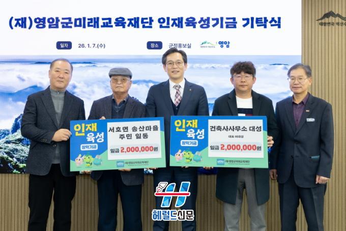 [Çì·²µå½Å¹® = ¼Û±Ù³² ±âÀÚ] ¿µ¾Ï±º ¼È£¸é ¼Û»ê¸¶À» ÁֹεéÀÌ 7ÀÏ Áö¿ª ÀÎÀç À°¼º ÀåÇÐ±Ý 200¸¸¿øÀ» ¿µ¾Ï±º¹Ì·¡±³À°Àç´Ü¿¡ ±âºÎÇß´Ù.