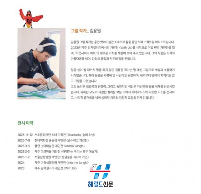 ±×¸²À» ±×¸° ±è¿ë¿ø ÇлýÀº ¿ëÀÎ ¹þÀ̹̼ú°ü ¼Ò¼Ó ¾ÆÆ®ºê·ò(Art Brut) ÀÛ°¡·Î¼ °³ÀÎÀü 8ȸ¿Í 50¿© ȸÀÇ ´ÜüÀü¿¡ Âü¿©ÇÏ´Â µî Ȱ¹ßÇÑ Ã¢ÀÛ È°µ¿À» ÀÌ¾î ¿ÔÀ¸¸ç Áö³ÇØ 1¿ù ¼¿ï»ï¼ºº´¿ø¿¡¼ ¿¸° °³ÀÎÀü¿¡¼ ÃâÆÇ»ç °ü°èÀÚÀÇ Á¦¾ÈÀ¸·Î À̹ø Ãâ°£ÀÌ ÃßÁøµÅ ±×ÀÇ ¿¹¼úÀû ¼ºÀåÀ» ´õ ¸¹Àº À̵é°ú °øÀ¯ÇÏ´Â °è±â°¡ µÇ¾ú´Ù.
