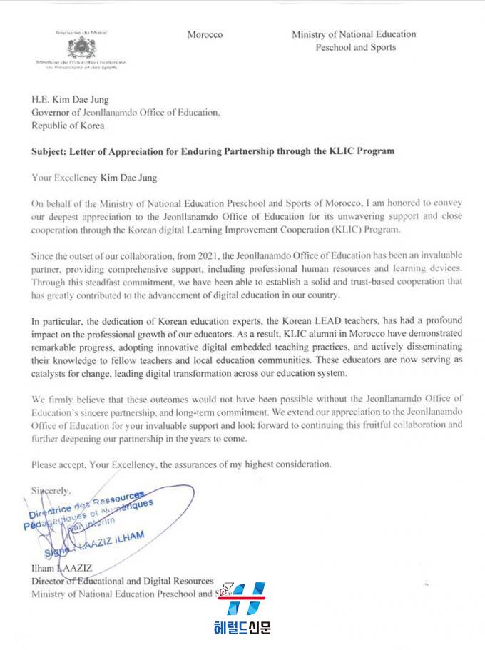 À̹ø °¨»ç ¼ÇÑÀº Àü¶ó³²µµ±³À°Ã»ÀÌ 2021³âºÎÅÍ ±³À° Á¤º¸È Áö¿ø »ç¾÷ (KLIC‧Korean Digital-Learning Improvement Cooperation)À» ÅëÇØ ¸ð·ÎÄÚ ±³À°ºÎ¿Í µðÁöÅÐ ±³À° ºÐ¾ß¿¡¼ Áö¼ÓÀûÀÎ Çù·ÂÀ» À̾î¿Â µ¥ ´ëÇÑ Æò°¡¸¦ ´ã°í ÀÖ´Ù.