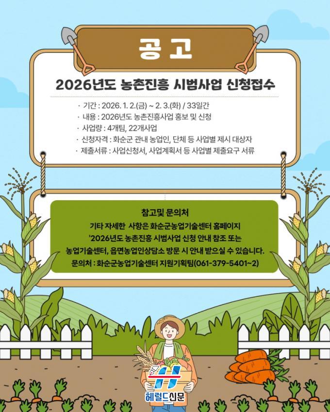 [Çì·²µå½Å¹® = ³ë½Â¾ð ±âÀÚ] ȼø±º(±º¼ö ±¸º¹±Ô)Àº ¡°¼ÒµæÀÌ ³ôÀº ºÎÀ¯ ³óÃÌ¡± ½ÇÇö°ú ȼø ³ó¾÷ °æÀï·Â °È¸¦ À§ÇØ ¡®2026³âµµ ³óÃÌÁøÈï ½Ã¹ü»ç¾÷¡¯ ½ÅûÀ» 2026³â 2¿ù 3ÀϱîÁö ½Åû¹Þ´Â´Ù°í ¹àÇû´Ù.