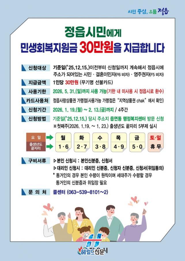 ½Åû ±â°£Àº ¿À´Â 19ÀϺÎÅÍ 2¿ù 13ÀϱîÁö 4ÁÖ°£ ÁøÇàµÈ´Ù. Áö¿ø±ÝÀ» ¹ÞÀ¸·Á´Â ½Ã¹ÎÀº 2025³â 12¿ù 15ÀÏ ±âÁØ ÁÖ¼ÒÁö °üÇÒ À¾¡¤¸é¡¤µ¿ ÇàÁ¤º¹Áö¼¾Å͸¦ ¹æ¹®ÇØ ½ÅûÇÏ¸é µÈ´Ù. º»ÀÎ ½Åû ½Ã ½ÅºÐÁõ°ú ½Åû¼¸¦ ÁöÂüÇØ¾ß Çϸç, ´ë¸®ÀÎÀÌ ¹æ¹®ÇÒ °æ¿ì À§ÀÓ µ¿ÀǼ¿Í À§ÀÓÀÚ ¹× ´ë¸®ÀÎÀÇ ½ÅºÐÁõÀ» ¸ðµÎ ì°Ü¾ß ÇÑ´Ù. 14¼¼ ÀÌÇÏ ¾Æµ¿ÀÇ Áö¿ø±ÝÀº ¹ýÁ¤´ë¸®ÀÎÀÌ ´ë½Å ¼ö·ÉÇÒ ¼ö ÀÖ´Ù.