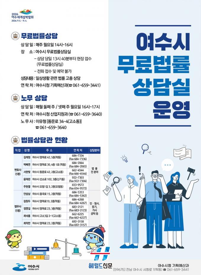 [Çì·²µå½Å¹® = ³ë½Â¾ð ±âÀÚ] ¿©¼ö½Ã°¡ ÀÌ´Þ 1¿ùºÎÅÍ ÀÏ»ó»ýȰ¿¡¼ ¹ý·ü¹®Á¦·Î ¾î·Á¿òÀ» °Þ°Å³ª ÇÇÇØ¸¦ º» ½Ã¹Î¿¡°Ô ¡®¹«·á ¹ý·ü »ó´ã¡¯À» Á¦°øÇÑ´Ù.