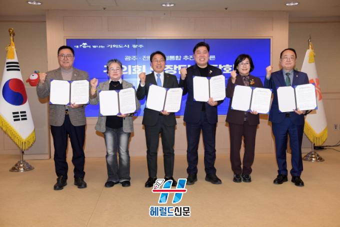 [Çì·²µå½Å¹® = ³ë½Â¾ð ±âÀÚ] ±¤ÁÖ½Ã¿Í 5°³ ÀÚÄ¡±¸ÀÇȸ°¡ (°¡Äª)±¤ÁÖÀü³²Æ¯º°½ÃÀÇ ¼º°øÀû ¾ÈÂøÀ» À§ÇÑ ¡®´ëÅëÇÕ °øµ¿ ¼±¾ð¡¯À» ¹ßÇ¥Çß´Ù.