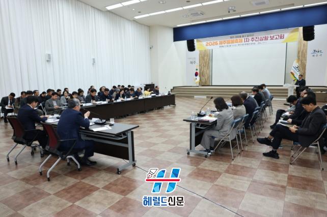 ±è¿Ï±Ù Á¦ÁÖ½ÃÀå ÁÖÀç·Î ÁøÇàµÈ À̹ø º¸°íȸ´Â 2026 Á¦ÁÖµéºÒÃàÁ¦ÀÇ ¼º°øÀûÀÎ °³ÃÖ¸¦ À§ÇÑ ÃàÁ¦ ¼¼ºÎ°èȹ°ú Áغñ»çÇ×À» Á¡°ËÇÏ°í ºÎ¼ °£ Çù·Âü°è¸¦ °ÈÇϱâ À§ÇØ ¸¶·ÃµÆ´Ù.