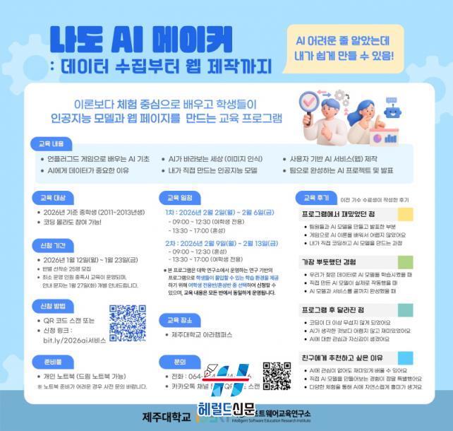 [Çì·²µå½Å¹® = Àü¿µ±Ô ±âÀÚ] Á¦ÁÖ´ëÇб³ Áö´É¼ÒÇÁÆ®¿þ¾î±³À°¿¬±¸¼Ò(¼ÒÀå Á¶Á¤¿ø)´Â 2026³â °Ü¿ï¹æÇÐÀ» ¸Â¾Æ µµ³» ÁßÇлýÀ» ´ë»óÀ¸·Î ÀΰøÁö´É(AI)À» Á÷Á¢ ¸¸µé°í Ȱ¿ëÇØº¸´Â üÇèÇü ±³À° ÇÁ·Î±×·¥ ¡¸³ªµµ AI ¸ÞÀÌÄ¿ : µ¥ÀÌÅÍ ¼öÁýºÎÅÍ À¥ Á¦ÀÛ±îÁö¡¹¸¦ ¿î¿µÇÑ´Ù.