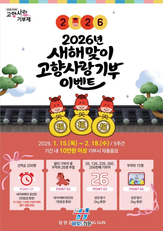 [Çì·²µå½Å¹® = Àü¿µ±Ô ±âÀÚ] ´ã¾ç±º(±º¼ö Á¤Ã¶¿ø)ÀÌ 2026³â º´¿À³â(ܰçíÒ´) ¡®ºÓÀº ¸»ÀÇ ÇØ¡¯¸¦ ¸Â¾Æ 1¿ù 15ÀϺÎÅÍ 2¿ù 18ÀϱîÁö 5ÁÖ°£ °íÇâ»ç¶û±âºÎ À̺¥Æ®¸¦ ½Ç½ÃÇÑ´Ù.