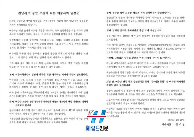 Á¤±â¸í ¿©¼ö½ÃÀåÀº ¡°¿©¼ö´Â °ú°Å Àü±¹ ÃÖÃÊ·Î ÁֹιßÀǸ¦ ÅëÇÑ ¡®3·Á ÅëÇÕ¡¯À» ÀÌ·ï³½ ÀÚÄ¡ ºÐ±ÇÀÇ »ó¡Àû µµ½Ã¡±¶ó¸ç ¡°À̹ø ÇàÁ¤ÅëÇÕÀÌ ¿©¼öÀÇ Á¤Ã¼¼ºÀ» ÁöŰ¸é¼µµ »õ·Î¿î µµ¾àÀÇ ±âȸ°¡ µÉ ¼ö ÀÖµµ·Ï ½Ã¹Îµé°ú ÇÔ²² Ä¡¹ÐÇÏ°Ô ´ëÀÀÇØ ³ª°¡°Ú´Ù¡±¶ó°í ¹àÇû´Ù.
