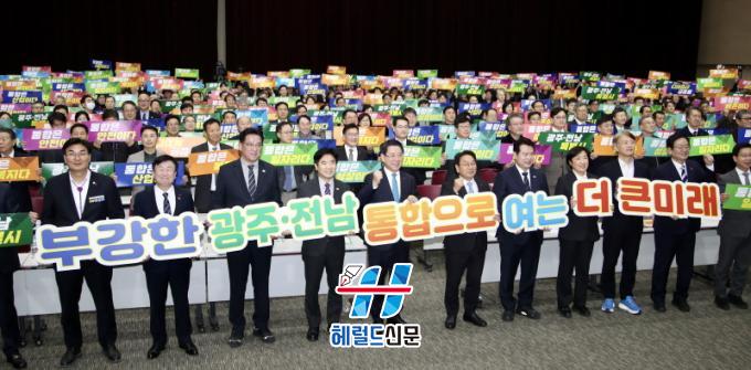 ÇùÀÇȸ À§¿øµéÀº °áÀǹ®À» ÅëÇØ ¡°¿ì¸®´Â Áö±Ý ±¤ÁÖ¿Í Àü³²ÀÌ Çϳª·Î ÈûÀ» ¸ð¾Æ »õ·Î¿î ¹Ì·¡·Î ³ª¾Æ°¡±â À§ÇÑ ¿ª»çÀû ÀüȯÁ¡¿¡ ¼ ÀÖ´Ù.¡±¸é¼ ¡°320¸¸ ½Ã¡¤µµ¹ÎÀÇ ¿¸ÁÀ» ¹Þµé¾î ÇàÁ¤ ÅëÇÕÀÇ ¼º°øÀû ¿Ï¼ö¿Í Ưº°¹ý Á¦Á¤¿¡ ³ª¼ÀÚ.¡±°í ´ÙÁüÇß´Ù.