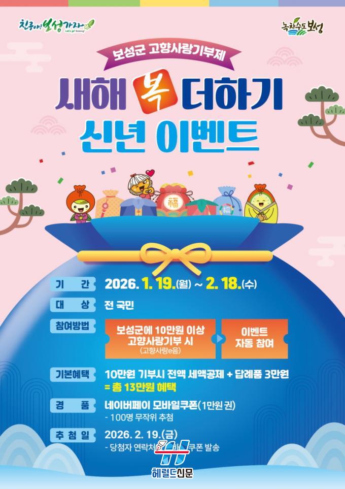 [Çì·²µå½Å¹® = Àü¿µ±Ô ±âÀÚ] º¸¼º±ºÀº 2026³â »õÇØ¸¦ ¸Â¾Æ °íÇâ»ç¶û±âºÎÁ¦ Âü¿©¸¦ È®´ëÇÏ°í ±âºÎ ¹®È¸¦ Ȱ¼ºÈÇϱâ À§ÇØ ¿À´Â 2¿ù 18ÀϱîÁö ¡®»õÇØ º¹ ´õÇϱ⠽ųâ À̺¥Æ®¡¯¸¦ ÃßÁøÇÑ´Ù°í ¹àÇû´Ù.