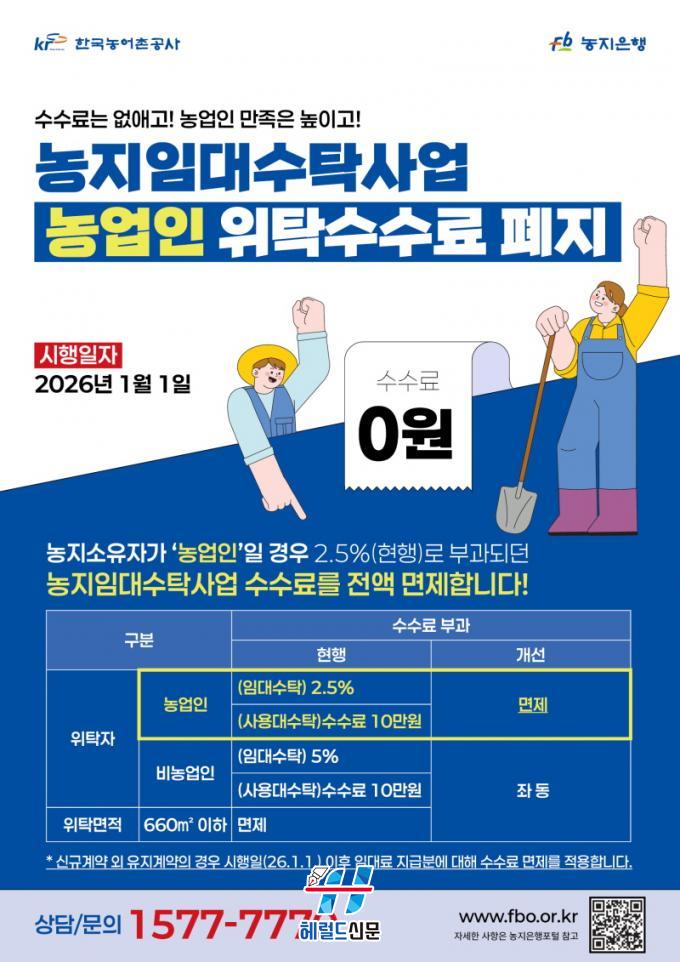 À̹ø °³ÆíÀ¸·Î À§Å¹ÀÚ°¡¡®³ó¾÷ÀΡ¯ÀÎ °æ¿ì, ³óÁöÀÓ´ëÀ§Å¹ ¼ö¼ö·á°¡ Àü¾× ¸éÁ¦µÈ´Ù. ¶ÇÇÑ ½Å±Ô °è¾à»Ó¸¸ ¾Æ´Ï¶ó ÇöÀç °è¾àÀ» À¯Áö ÁßÀÎ ³ó¾÷Àο¡°Ôµµ 2026³â 1¿ù 1ÀÏ ÀÌÈÄ ºÎ°úµÇ´Â ¼ö¼ö·á¿¡ ´ëÇØ¼´Â ¸éÁ¦ ÇýÅÃÀ» µ¿ÀÏÇÏ°Ô Àû¿ëÇÑ´Ù.