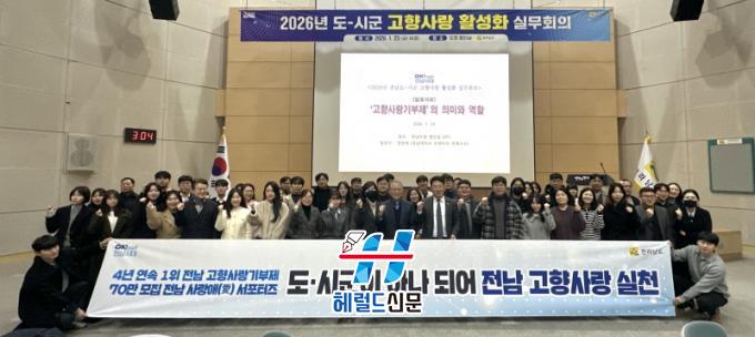 [Çì·²µå½Å¹® = ³ë½Â¾ð ±âÀÚ] Àü¶ó³²µµ´Â 23ÀÏ 22°³ ½Ã±º°ú ÇÔ²² °íÇâ»ç¶û±âºÎÁ¦ 4³â ¿¬¼Ó Àü±¹ 1À§, Àü³² »ç¶û¾Ö(äñ) ¼Æ÷ÅÍÁî 70¸¸ ¸í ¸ðÁý ¸ñÇ¥ ´Þ¼ºÀ» À§ÇÑ °íÇâ»ç¶û Ȱ¼ºÈ ½Ç¹«È¸ÀǸ¦ ¿°í, °øµ¿ Çù·Â ¹æ¾ÈÀ» ³íÀÇÇß´Ù.