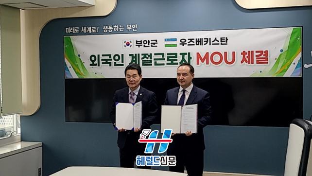 [Çì·²µå½Å¹® = ³ë½Â¾ð ±âÀÚ] ºÎ¾È±ºÀº Áö³ 23ÀÏ ³ó¾÷ ºÐ¾ß ¿Ü±¹ÀÎ °èÀý±Ù·ÎÀÚ µµÀÔ È®´ë¸¦ À§ÇØ ¿ìÁŰ½ºÅº ¾ÈµðÀÜÁÖ¿Í ¾÷¹«Çù¾à(MOU)À» ü°áÇß´Ù°í ¹àÇû´Ù.