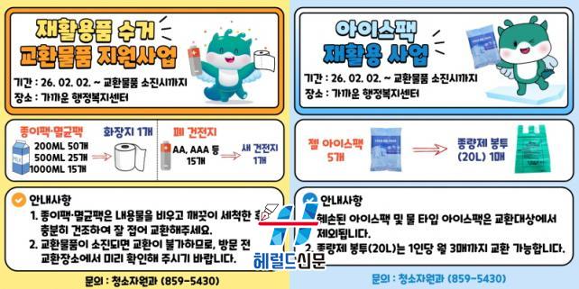 26ÀÏ ÀÍ»ê½Ã¿¡ µû¸£¸é ÀçȰ¿ëǰ ¼ö°Å ±³È¯¹°Ç° Áö¿ø»ç¾÷Àº 2¿ù 2ÀϺÎÅÍ ¿î¿µÀ» ½ÃÀÛÇϸç, ½Ã¹Î ´©±¸³ª °¡±î¿î À¾¡¤¸é¡¤µ¿ ÇàÁ¤º¹Áö¼¾Å͸¦ ¹æ¹®ÇØ Âü¿©ÇÒ ¼ö ÀÖ´Ù.