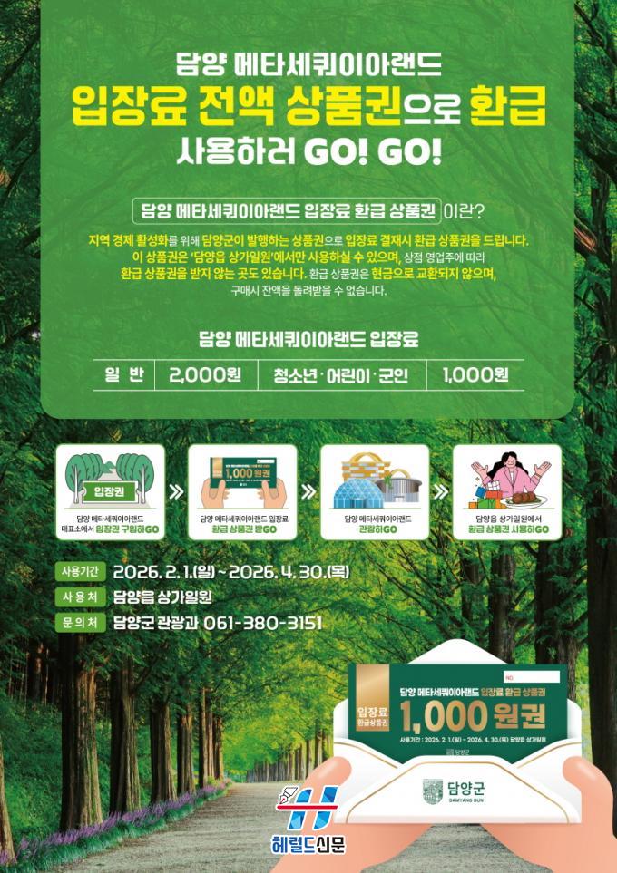 [Çì·²µå½Å¹® = Àü¿µ±Ô ±âÀÚ] ´ã¾ç±ºÀÌ ¿À´Â 2¿ù 1ÀϺÎÅÍ ´ëÇ¥ °ü±¤ÁöÀÎ ¸ÞŸ¼¼ÄõÀÌ¾Æ °¡·Î¼ö±æÀ» ã´Â °ü±¤°´À» ´ë»óÀ¸·Î ÀÔÀå·á Àü¾×À» ´ã¾ç»ç¶û»óǰ±ÇÀ¸·Î ȯ±ÞÇÏ´Â ¡®»ó»ý ÆäÀ̹顯 Á¦µµ¸¦ ½ÃÇàÇÑ´Ù.