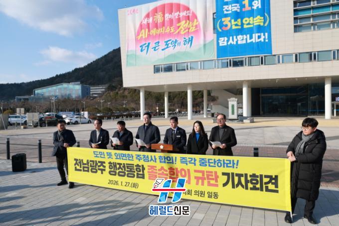 [Çì·²µå½Å¹® = ³ë½Â¾ð ±âÀÚ] ¹«¾È±ºÀÇȸ(ÀÇÀå ÀÌÈ£¼º)´Â 1¿ù 27ÀÏ Àü³²µµÃ» Àܵð±¤Àå¿¡¼ ±âÀÚȸ°ßÀ» ¿°í, À̳¯ ¹ßÇ¥µÈ Àü³²¡¤±¤ÁÖ ÇàÁ¤ÅëÇÕ °ü·Ã ÇÕÀÇ ³»¿ëÀ» µÎ°í ¡°±íÀº À¯°¨À» ³Ñ¾î °·ÂÇÑ ºÐ³ë¸¦ Ç¥ÇÑ´Ù¡±¸ç ±è¿µ·Ï Àü¶ó³²µµÁö»ç¸¦ Á¤¸éÀ¸·Î ±ÔźÇß´Ù.