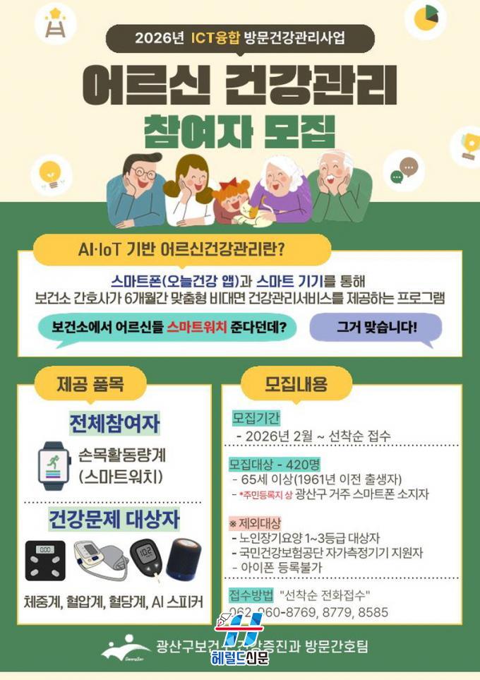 [Çì·²µå½Å¹® = ³ë½Â¾ð ±âÀÚ] ±¤ÁÖ ±¤»ê±¸°¡ 65¼¼ ÀÌ»ó ¾î¸£½ÅÀ» ´ë»óÀ¸·Î ÀΰøÁö´É(AI)¡¤»ç¹°ÀÎÅͳÝ(IoT) ±â¹Ý ¾î¸£½Å °Ç°°ü¸® »ç¾÷ ½Å±Ô Âü¿©ÀÚ 420¸íÀ» ¼±Âø¼ø ¸ðÁýÇÑ´Ù.
