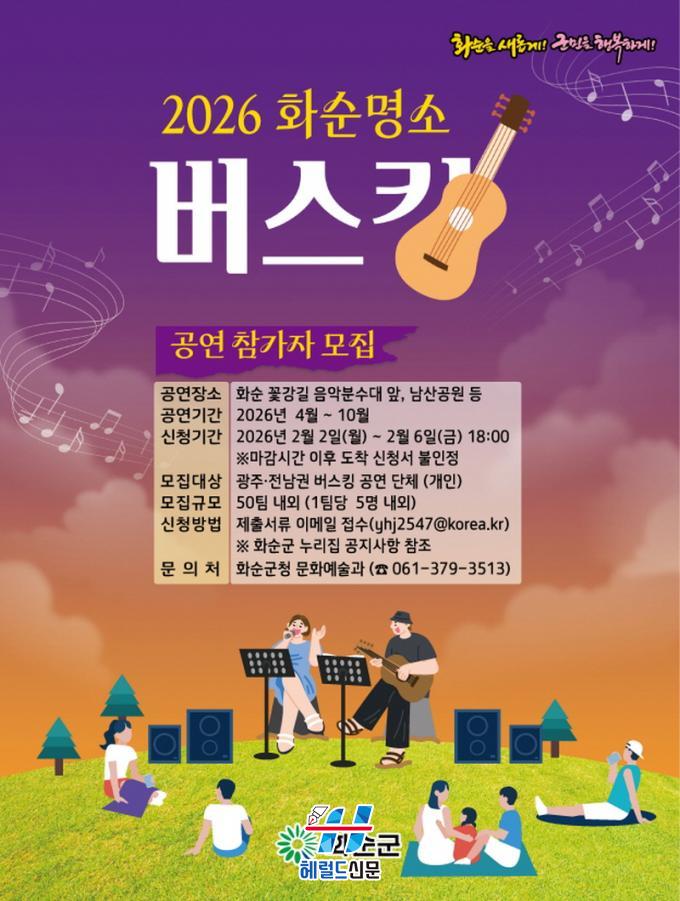 [Çì·²µå½Å¹® = ³ë½Â¾ð ±âÀÚ] ȼø±º(±º¼ö ±¸º¹±Ô)Àº 29ÀÏ Áö¿ª °ü±¤ Ȱ¼ºÈ¿Í ÀÏ»ó ¼Ó ¹®È ÇâÀ¯ ±âȸ È®´ë¸¦ À§ÇØ ¡®2026 ȼø ¸í¼Ò ¹ö½ºÅ·¡¯¿¡ Âü¿©ÇÒ °ø¿¬ÀÚ¸¦ °ø°³¸ðÁý ÇÑ´Ù°í ¹àÇû´Ù.