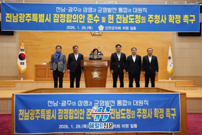 [Çì·²µå½Å¹® = Àü¿µ±Ô ±âÀÚ] ½Å¾È±ºÀÇȸ(ÀÌ»óÁÖ ÀÇÀå)´Â ÃÖ±Ù Á¤Ä¡±Ç°ú Á¤ºÎÂ÷¿ø¿¡¼ Àü³²¡¤±¤ÁÖ ÇàÁ¤ÅëÇÕ ³íÀǰ¡ º»°ÝȵǴ °¡¿îµ¥, 1¿ù 29ÀÏ º»È¸ÀÇÀå¿¡¼ Àü³²¡¤±¤ÁÖ ÇàÁ¤ÅëÇÕ°ú °ü·ÃÇØ Àü³²±¤ÁÖÆ¯º°½Ã ÀáÁ¤ÇÕÀÇ¾È Áؼö¿Í Çö Àü¶ó³²µµÃ»ÀÇ ÁÖû»ç È®Á¤À» Ã˱¸ÇÏ´Â °áÀǹ®À» ¹ßÇ¥Çß´Ù.