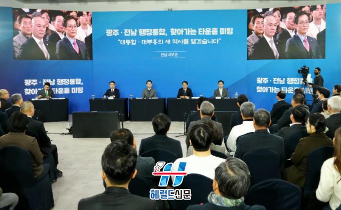 [Çì·²µå½Å¹® = ³ë½Â¾ð ±âÀÚ] ±¤ÁÖ½Ã¿Í Àü³²µµ°¡ ±¤ÁÖÀü³² ÇàÁ¤ÅëÇÕ¿¡ ´ëÇÑ ±Ã±ÝÁõ°ú ¿ì·Á¸¦ ÇØ¼ÒÇϱâ À§ÇØ ±Ç¿ªº°·Î ½Ã¡¤µµ¹Î°ú Á÷Á¢ ¼ÒÅëÇÏ´Â ¡®Ã£¾Æ°¡´Â Ÿ¿îȦ¹ÌÆÃ¡¯À» ¸¶·Ã, ÅëÇÕ ¹æÇâ°ú °úÁ¦¿¡ ´ëÇØ °ø°³ Åä·ÐÀ» ÁøÇàÇß´Ù.