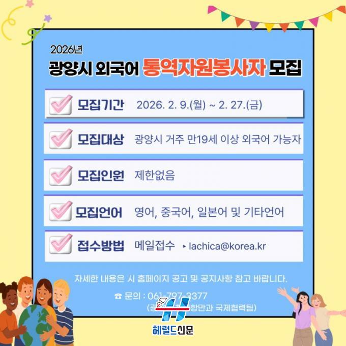 [Çì·²µå½Å¹® = ³ë½Â¾ð ±âÀÚ] ±¤¾ç½Ã´Â °¢Á¾ ÃàÁ¦¿Í ±¹Á¦Çà»ç¿¡¼ÀÇ Å뿪 Áö¿ø°ú ¿Ü±¹ÀÎ ¹Î¿ø ¾È³» µî ´Ù¾çÇÑ ºÐ¾ß¿¡¼ Å뿪 ºÀ»ç¿¡ Âü¿©ÇÒ ½Ã¹Î ¿Ü±¹¾î Å뿪ÀÚ¿øºÀ»çÀÚ¸¦ 2¿ù 9ÀϺÎÅÍ 2¿ù 27ÀϱîÁö ¸ðÁýÇÑ´Ù°í ¹àÇû´Ù.