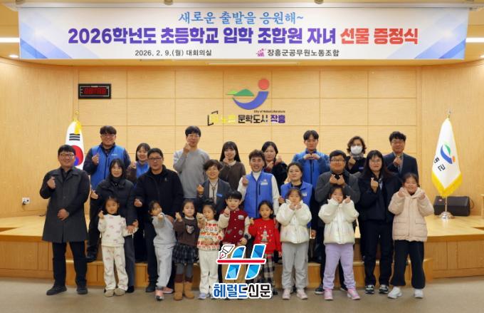 [Çì·²µå½Å¹® = Á¤¾ç¼® ±âÀÚ] ÀåÈﱺ°ú ÀåÈﱺ°ø¹«¿ø³ëµ¿Á¶ÇÕÀº Áö³ 9ÀÏ, 2026Çг⵵ ÃʵîÇб³ ÀÔÇÐÀ» ¾ÕµÐ Á¶ÇÕ¿ø ÀÚ³à¿Í °¡Á¤À» °Ý·ÁÇÏ´Â Çà»ç¸¦ ¿°í Çпëǰ ¼¼Æ®¸¦ Àü´ÞÇß´Ù.