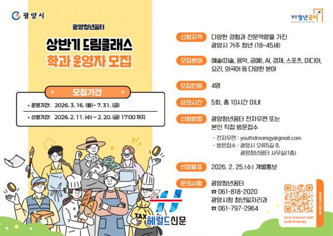[Çì·²µå½Å¹® = ³ë½Â¾ð ±âÀÚ] ±¤¾ç½Ã´Â û³âÀÌ Á÷Á¢ ±âȹÇÏ°í ¿î¿µÇϴ û³â ÁÖµµÇü ±³À° ÇÁ·Î±×·¥ÀÎ ¡®2026 »ó¹Ý±â µå¸²Å¬·¡½º¡¯ ¿î¿µÀÚ(°»ç)¸¦ ¸ðÁýÇÑ´Ù°í ¹àÇû´Ù.