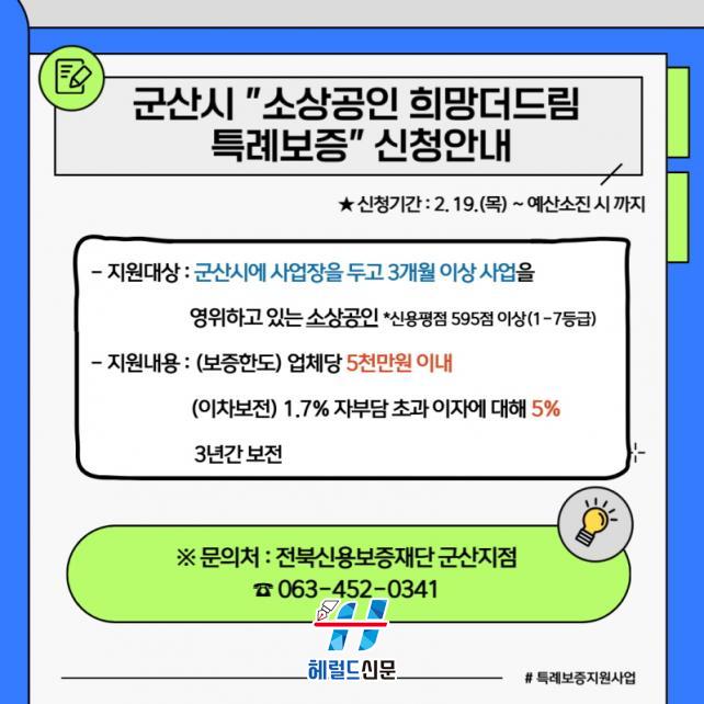 »ç¾÷Á¢¼ö´Â ¿À´Â 19ÀϺÎÅÍ ÀÚ±Ý ¼ÒÁø ½Ã±îÁö ÁøÇàµÇ¸ç, Áö¿ø ´ë»óÀº ±º»ê½Ã¿¡¼ 3°³¿ù ÀÌ»ó »ç¾÷ÀåÀ» ¿î¿µÇÏ´Â ½Å¿ëÆòÁ¡ 595Á¡ ÀÌ»ó(1~7µî±Þ) ¼Ò»ó°øÀÎÀÌ´Ù.