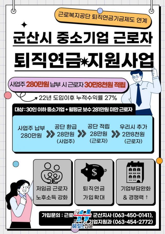[Çì·²µå½Å¹® = ³ë½Â¾ð ±âÀÚ] ±º»ê½Ã°¡ Áß¼Ò±â¾÷°ú ¼Ò»ó°øÀÎ ±Ù·ÎÀÚµéÀÌ Æó¾÷ µîÀ¸·Î ÅðÁ÷±ÝÀ» Á¦´ë·Î ¹ÞÁö ¸øÇÏ´Â »ç·Ê°¡ Áõ°¡ÇÔ¿¡ µû¶ó, ±Ù·ÎÀÚ ³ëÈÄ¼Òµæ º¸ÀåÀ» °ÈÇϱâ À§ÇØ ¡®ÅðÁ÷¿¬±Ý Ãß°¡ Áö¿ø»ç¾÷¡¯À» Àü±¹ ÃÖÃÊ·Î ¿À´Â 3¿ù ÀÌÈÄ ½ÃÇàÇÑ´Ù.