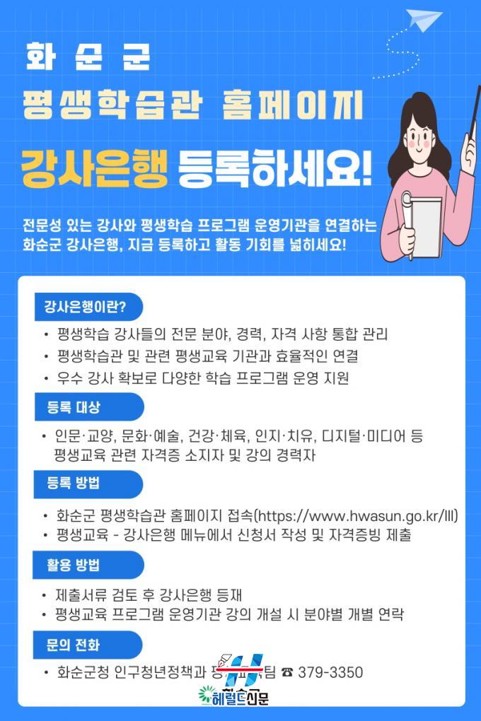 µî·ÏÀ» Èñ¸ÁÇÏ´Â °æ¿ì ȼø±º Æò»ýÇнÀ°ü ȨÆäÀÌÁö(https://www.hwasun.go.kr/lll)¿¡¼ ¡®Æò»ý±³À° °»çÀºÇà µî·Ï ¸Þ´º¡¯¸¦ ÅëÇØ ½Åû¼¿Í ÀÚ°Ý Áõºù ¼·ù¸¦ Á¦ÃâÇÏ¸é µÈ´Ù.