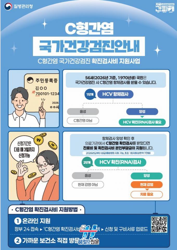 Áúº´°ü¸®Ã»Àº 2026³âºÎÅÍ 56¼¼(1970³â»ý)¸¦ ´ë»óÀ¸·Î ±¹°¡°Ç°°ËÁø¿¡¼ CÇü°£¿° Ç×ü ¾ç¼º ÆÇÁ¤À» ¹ÞÀº °æ¿ì, È®Áø °Ë»çºñ Áö¿ø ÀÇ·á±â°üÀ» ±âÁ¸ º´¡¤ÀÇ¿ø±Þ¿¡¼ »ó±Þ¡¤Á¾ÇÕº´¿ø±îÁö Æ÷ÇÔÇÑ ¸ðµç ÀÇ·á±â°üÀ¸·Î È®´ëÇÑ´Ù. Áö¿ø Ç׸ñÀº ÁøÂû·á¿Í °Ë»çºñ º»Àκδã±ÝÀÌ´Ù. 1ȸ ÃÖ´ë 7¸¸ ¿øÀ» Áö¿øÇÑ´Ù.
